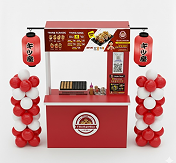 With stall, logo, lights, tarps, machine, lanterns, balloons, grand opening setup